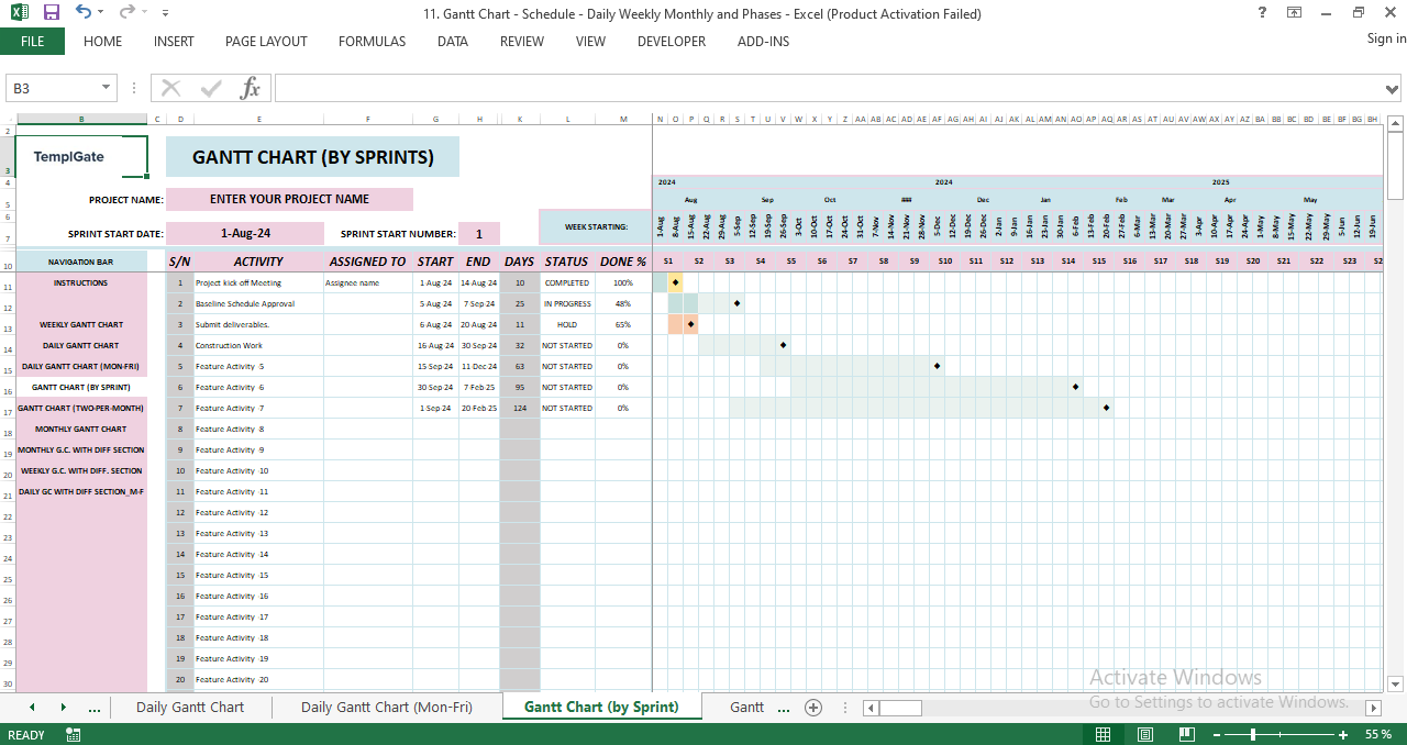 Unlike basic Gantt tools you see online, this template gives you nine complete dashboards, allowing you to view your project from every angle: daily, weekly, monthly, by sprints, by development phases, and more.