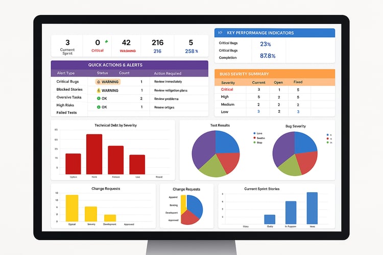 Your dashboard updates automatically from the data sheets and gives a portfolio-level view of: