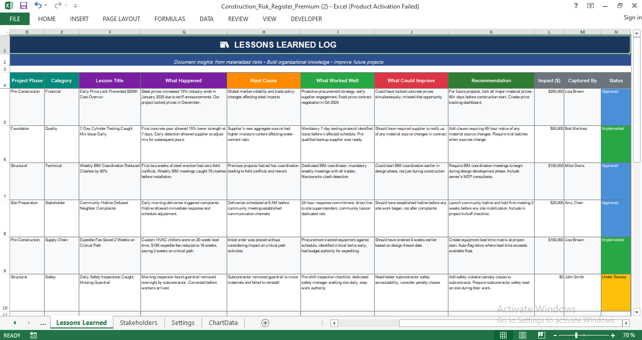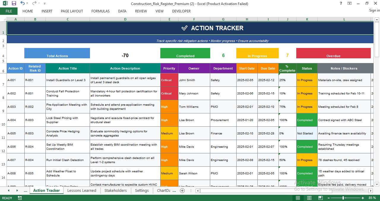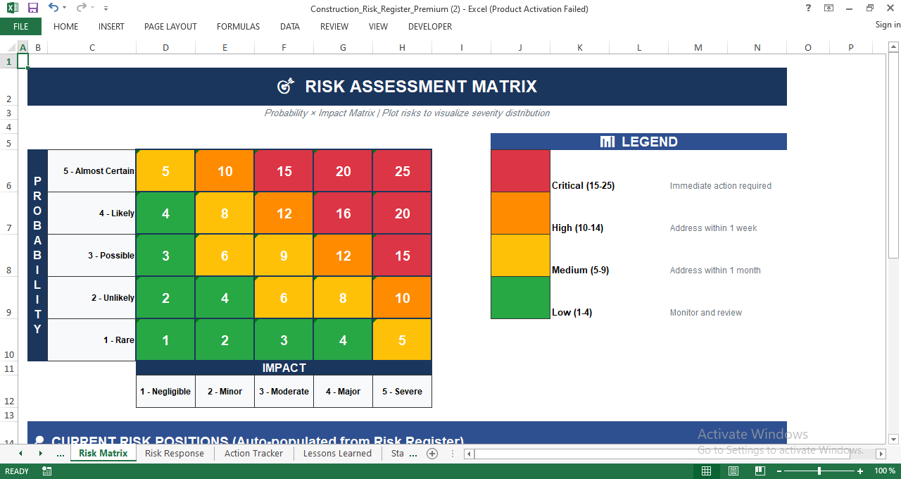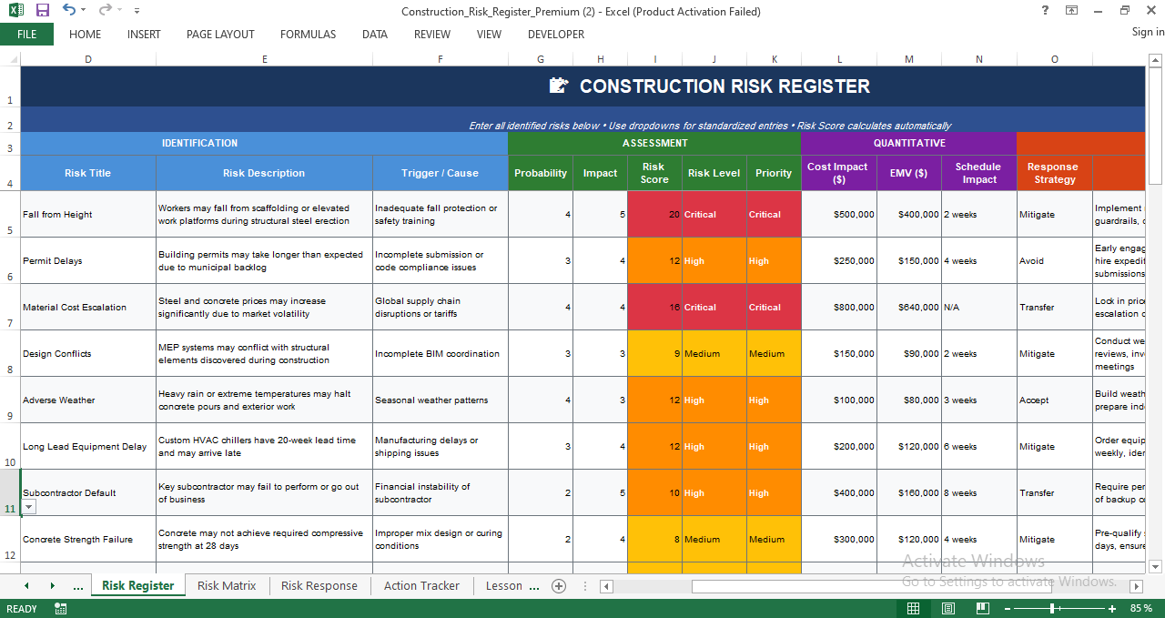 The Construction Risk Register is a comprehensive, executive-ready Excel system designed to help construction project managers, engineers, PMOs, and site teams identify, assess, monitor, and control project risks across the entire project lifecycle.
